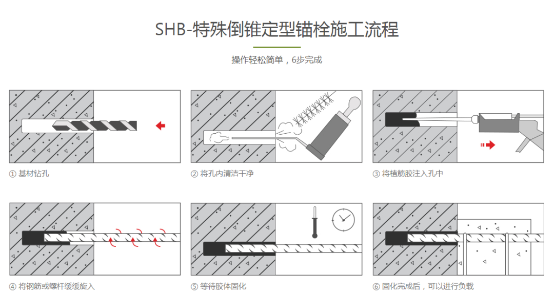 SHB-特殊倒錐形化學(xué)錨栓栓由螺桿、平墊、螺母組成,通過化學(xué)粘接劑保證錨栓與混凝土體的粘接強度,又通過倒錐體與混凝土機械鎖鍵保證連接強度。需配合施邦改性環(huán)氧注射式植筋膠使用。
