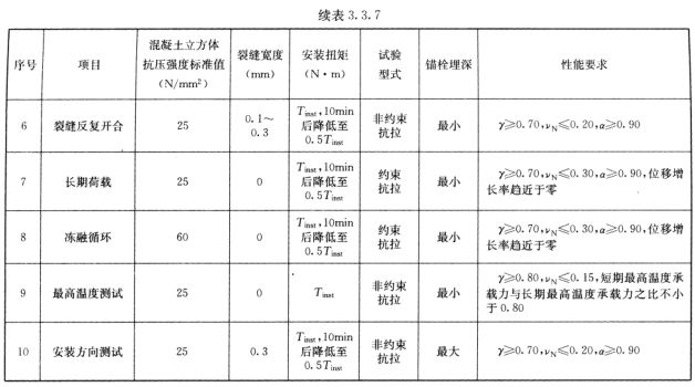 JCJ 145-2013《混凝土結(jié)構(gòu)后錨固技術(shù)規(guī)程》3.3.7-1適用于開裂混凝土的特殊倒錐形化學(xué)錨栓,應(yīng)滿足表3.3.7的錨固性能要求。JCJ 145-2013《混凝土結(jié)構(gòu)后錨固技術(shù)規(guī)程》3.3.7-2適用于不開裂混凝土的特殊倒錐形化學(xué)錨栓,應(yīng)滿足表3.3.7中第2、6項以外項目的性能要求。