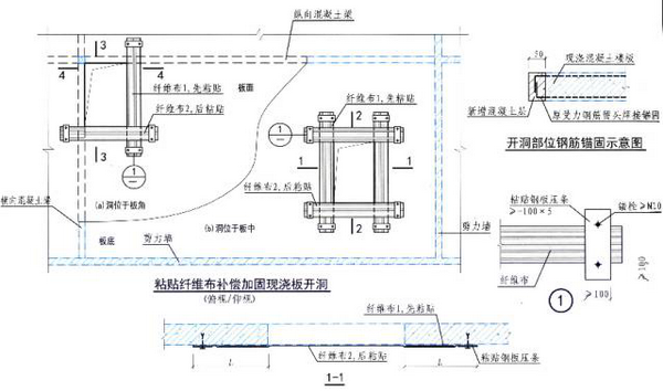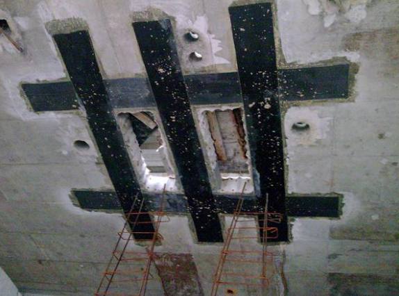 開洞后板面筋的減少,導致承載力降低,因此應對開洞后的樓板進行內力分析和承載力驗算之后,再結合樓板性質、開洞大小及形狀等差異,分別采用合適的加固處理方法。接下來施邦為大家介紹粘鋼或碳纖維布這兩種常用的加固措施供大家參考。