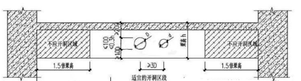 3)洞口下緣應(yīng)至少距梁底10公分以上,以免損傷或打斷梁底鋼筋;(只針對住宅樓梁,如果碰到跨度大,截面大的梁,應(yīng)距離更遠(yuǎn))