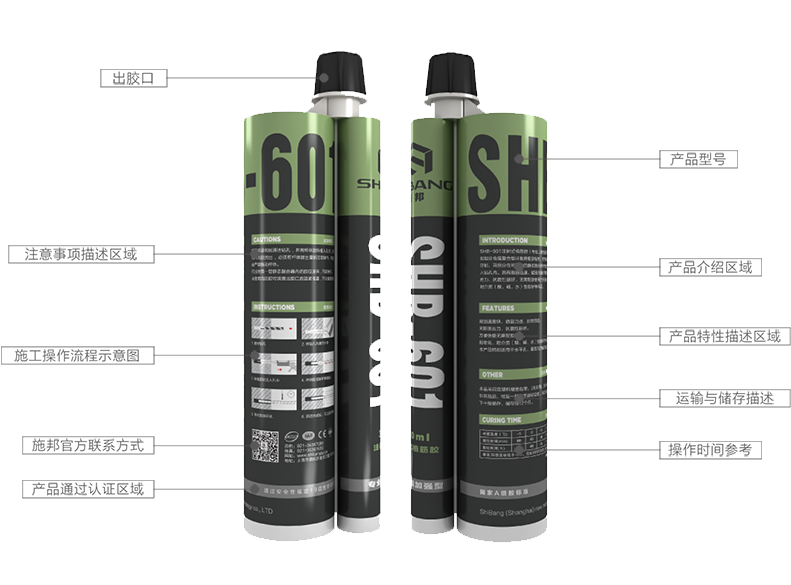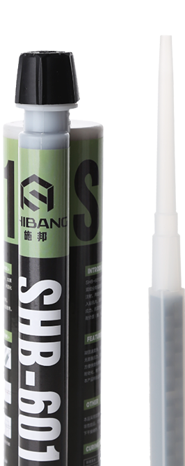 SHB-601注射式植筋膠(專業(yè)工程加強型)系A、B組分高強復合型環(huán)氧樹脂膠粘劑,使用專用的注射槍注射,兩組分在可更換的靜態(tài)混合器中充分混合直接注入鉆孔內